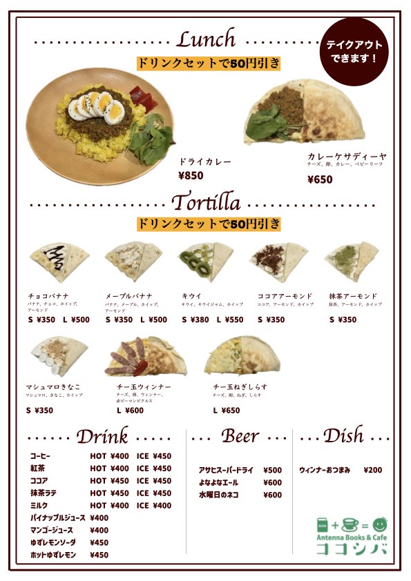 FOOD & DRINK LUNCH – ランチ ドライカレー850円※大盛り+100円 ドライカレーケサディーヤ650円 TORTILLA – トルティーヤ チョコバナナS 350円L 500円 メープルバナナS 350円L 500円 キウイS 380円L 550円 ココアアーモンドS 350円 抹茶アーモンドS 350円 マシュマロきなこS 350円 チー玉ウィンナーL 600円 チー玉ねぎしらすL 650円 DRINK – ドリンク コーヒーHOT 400円ICE 450円 紅茶HOT 400円ICE 450円 ココアHOT 450円ICE 450円 抹茶ラテHOT 450円ICE 450円 ジンジャーHOT 450円SODA 450円 マンゴージュース400円 FacebookXBluesky